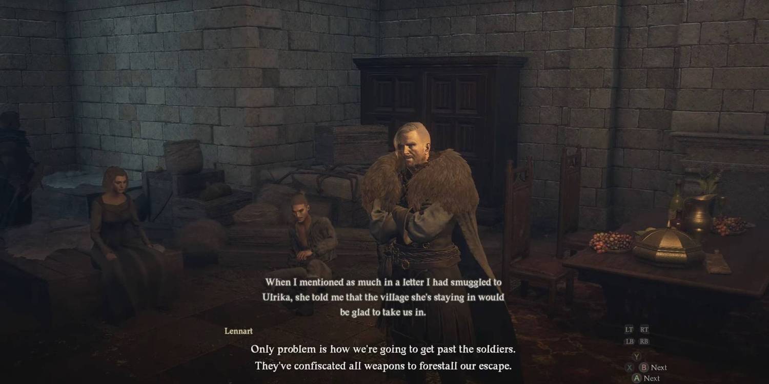 Al intentar ingresar a Melve, un guardia designado por Martin bloqueará la entrada a menos que le den 5000 de oro. Después de pagar el soborno, dirígete a la casa de Ulrika y habla con Lennart, quien le pide al jugador cuatro espadas para armar a la gente del pueblo contra los guardias de Martin.