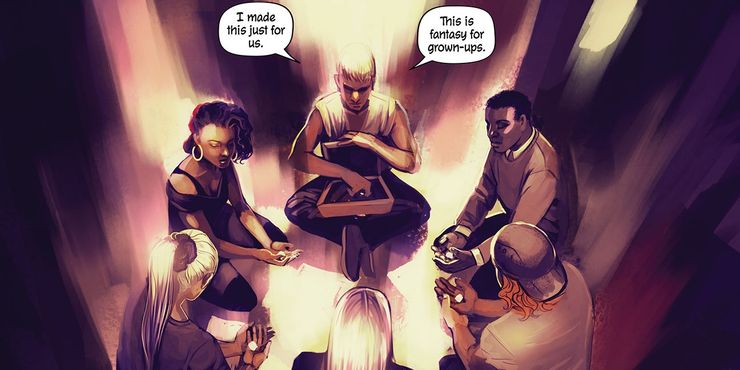 En la historia de fondo de la MORIR serie cómica, un grupo de adolescentes jugando un juego de rol con clásico D&D Los dados poliédricos se transportan al escenario de su juego, obtienen los poderes de los personajes que crearon, se embarcan en aventuras y regresan al mundo real completamente traumatizados por el condenado mundo de juegos de rol de mesa de fantasía que soportaron. Años más tarde, como adultos embrujados, son arrastrados de regreso al mundo en forma de icosaedro de MORIR, allí para enfrentarse a los demonios de su pasado y descubrir qué le sucedió al amigo Dungeon Master que dejaron atrás. A primera vista, esta trama parece aterrizar de lleno en el campo anti-escapismo; sin embargo, la construcción del mundo llena de homenaje de MORIR y las reglas detalladas que Kieron Gillen y Stephanie Hans redactaron para el MORIR Los juegos de rol de mesa provienen claramente de un lugar de amor por el pasatiempo de los juegos de rol. En lugar de condenar el escapismo, el MORIR comic advierte a los fanáticos y jugadores de mesa que tengan cuidado con lo que sueñan con escapar, y el juego dentro de un juego MORIR La adaptación de RPG no es diferente.