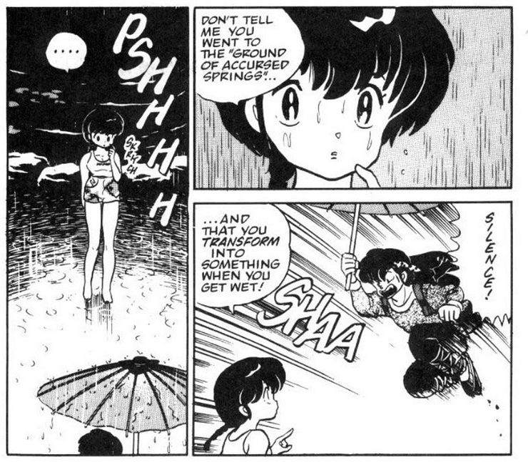 Ranma 1/2 por la aclamada mangaka Rumiko Takahashi sigue a Ranma Saotome, un luchador que se encuentra maldito después de caer en una piscina antigua donde una niña se ahogó mientras entrenaba con su padre. Ahora, cada vez que Ranma entra en contacto con agua fría, se convierten en una niña mientras que el agua caliente invierte el proceso. Pasan la mayor parte de la serie tratando de encontrar una manera de detener la maldición y volver a ser como eran las cosas antes mientras navegan viviendo con Akane, una chica con la que se espera que se casen. También se encuentran convirtiéndose en su forma de niña para ayudar a resolver conflictos.