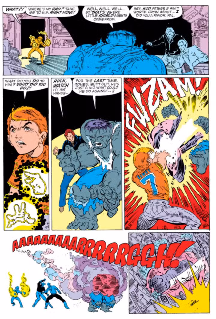 El padre, comprensiblemente asustado por la aparición de Hulk, saca un arma. Hulk, siendo Hulk, no está tan preocupado por un arma insignificante y se prepara para causarle muchos problemas al padre. Ahí es cuando el hijo revela sus poderes y ataca a Hulk con explosiones de desintegración. Efectivamente, es Alex Woolcot.
