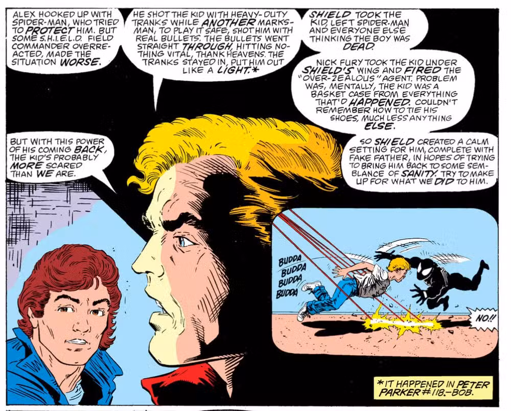 La muerte de Alex Woolcot conmocionó a los lectores. Los fanáticos de Spider-Man estaban acostumbrados a ver personajes asesinados, pero que Marvel llegara tan lejos como para que SHIELD le disparara a un niño por la espalda y lo matara a solo unos metros de Spider-Man fue un nivel completamente nuevo de trágica. Y se suponía que no iba a suceder.