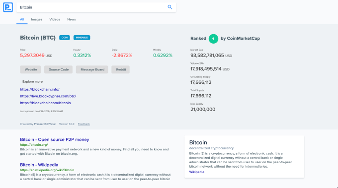 Se puede ver un ejemplo de uno de estos paquetes comunitarios realizando una búsqueda previa de “bitcoin”, que devuelve el siguiente bloque de información relacionada con la criptomoneda sobre el resto de los resultados de búsqueda: