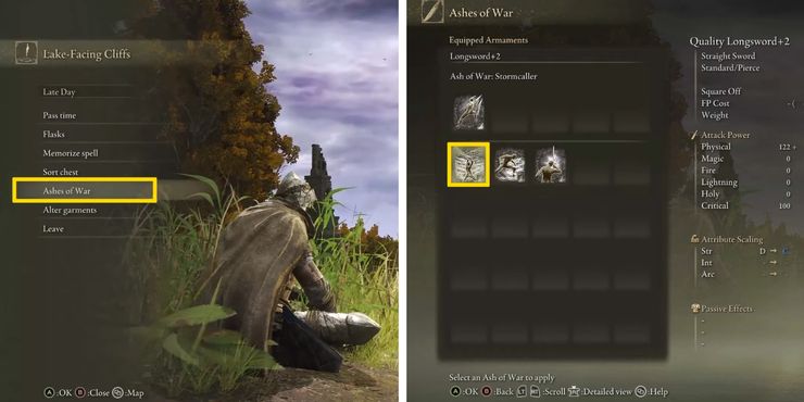Aparecerá una ventana de afinidad cuando los jugadores elijan el arma con la que quieren usar Ashes of War. Aquí, los jugadores pueden elegir la afinidad estándar sin cambios o la afinidad de calidad de Storm Stomp, lo que reduce la potencia base del arma pero aumenta la escala en función de la fuerza y la destreza del jugador. Más adelante, otras Ashes of War obtenidas proporcionarán muchas más opciones. Una vez que se complete la selección de Ashes of War, salga del Sitio de Gracia para usar la habilidad especial. Los jugadores deben recordar que es posible que algunas armas deban sujetarse con las dos manos si la habilidad Armas Ashes of War en Anillo de Elden Está activado.