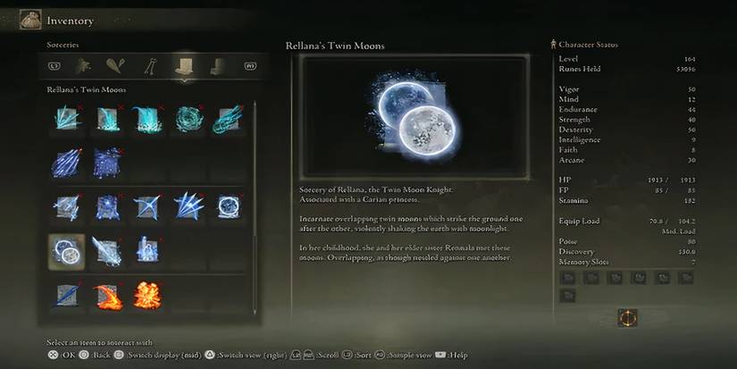 Las lunas gemelas de Rellana que golpearán el suelo uno tras otro, lanzando a los oponentes al aire. Este hechizo requiere 72 de inteligencia.lo que lo convierte en un fuerte contendiente para configuraciones de inteligencia pura. Esto es perfecto porque el bastón de inteligencia de mayor escala, el Cetro real de Caria, potencia los hechizos lunares. El otro hechizo es