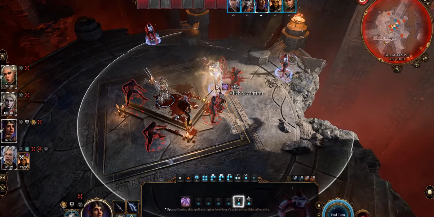 Combatientes a distancia en BG3 debe permanecer en la parte superior de las escaleras, con las criaturas convocadas colocadas estratégicamente al frente para protegerse contra los ataques de los cultistas de Orin. Esta configuración les permite ejecutar ataques a distancia de alto daño de forma segura. Despliega tus hazañas, acciones y hechizos más poderosos sin reservas para eliminar rápidamente a Orin y asegurar la victoria.