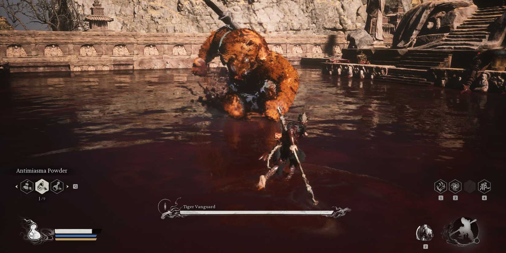 Uno de los Tiger Vanguard Su principal truco de batalla es su habilidad de convertirse en piedra.Cuando esto ocurra, no lo ataques, ya que tus golpes no harán daño o rebotarán por completo, dejándote expuesto a un contraataque. En general, debes tomarte las cosas con calma. Mito negro: Wukong y o bien no atacar en absoluto, o bien detener el combo para evitar el peligro.