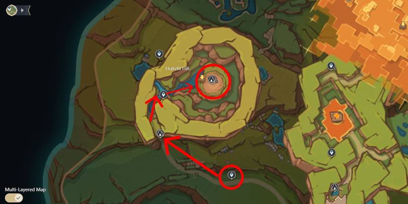 La segunda forma de llegar a la arena donde reside el Tirano Qucusaurio de Llama Dorada es a través de un agujero en el suelo, justo encima de la arena. El icono del jefe debería aparecer en el mapa del juego, por lo que podrías tomarte la molestia de escalar las llanuras más altas de la colina Huitztli y saltar a través del agujero. Tan pronto como comiences a descender y acercarte a la arena, la pelea contra el jefe debería comenzar.por lo que es posible que no tengas tiempo para prepararte adecuadamente. Esta es otra razón por la que el primer camino hacia el jefe Natlan en Impacto de Genshin Se recomienda.