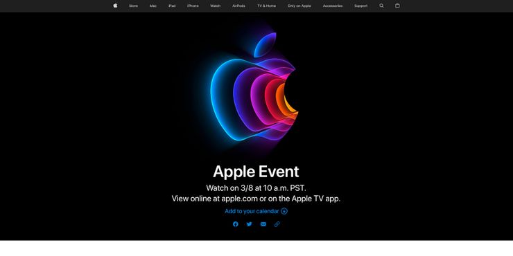 Para las personas que no quieren ver el evento de Apple en YouTube, hay otras opciones. La siguiente mejor opción es mirar directamente en el sitio web de Apple. Visitar el sitio web de Apple a la 1:00 p. m. EST del 8 de marzo debería llevarlo directamente al video transmitido en vivo. También puede visitar la página Eventos antes de esa fecha y agregar el evento a su calendario.