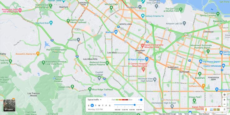 Los usuarios también pueden verificar los datos de tráfico en vivo en el sitio web de Google Maps. Para hacer esto, abra el sitio web de Google Maps en cualquier navegador web moderno, como Chrome, Firefox, Edge o Safari. Una vez que la región de destino se abre en el mapa, desplace el cursor sobre el Capas en la esquina inferior izquierda para expandir el menú. El menú ampliado mostrará una serie de opciones adicionales, que incluyen Terreno, Tránsito, Tráfico y más. Haga clic en Tráfico para ver líneas codificadas por colores a lo largo de todas las carreteras en el mapa.