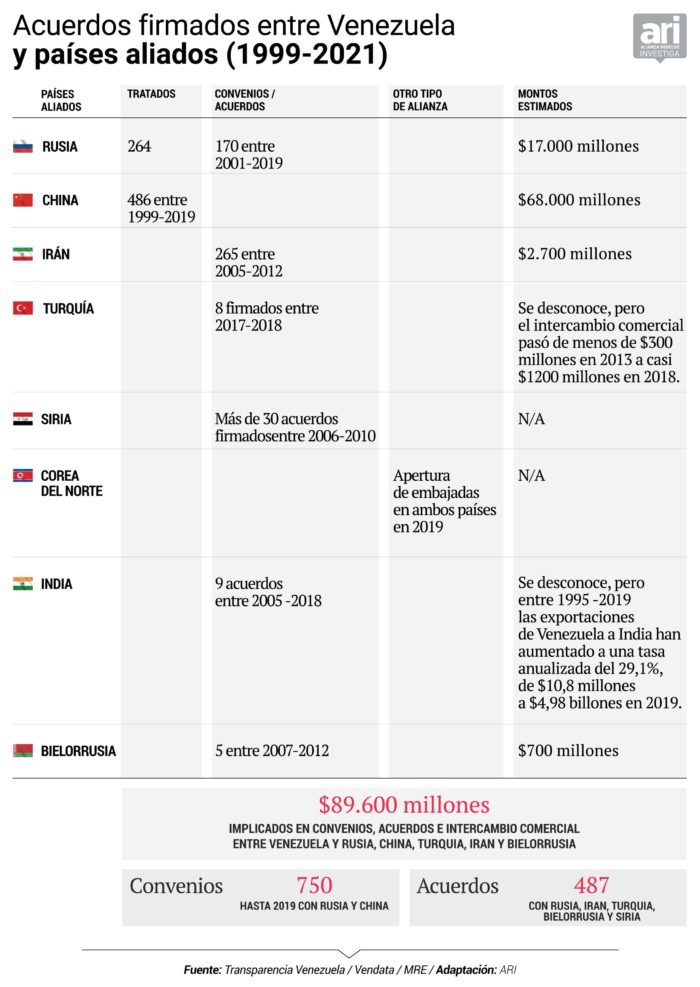 Sin importar la distancia geográfica, en el último lustro Venezuela ha reforzado alianzas con naciones que tienen en común su aversión contra EE.UU., gobiernos autoritarios con mandatarios con larga permanencia en el poder y altos índices de corrupción. La revisión de documentos oficiales disponibles, como gacetas y notas de prensa del Ministerio de Relaciones Exteriores, permite estimar que durante la era chavista, Venezuela ha firmado con estas naciones al menos unos 1.237 convenios, tratados y acuerdos de cooperación por un monto que ronda los $173 mil millones, aunque la opacidad que rodea estos negocios impide conocer la verdadera magnitud de los montos transados.