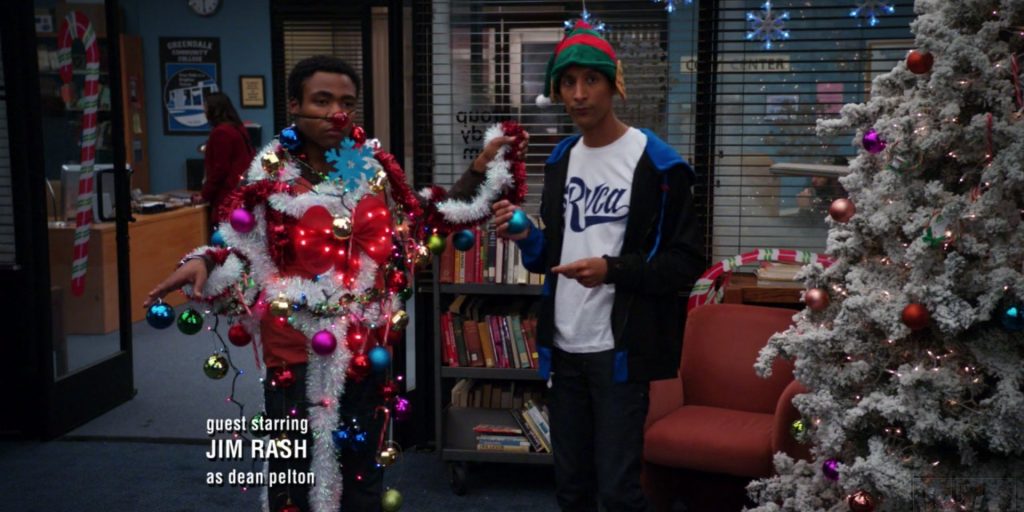 En los momentos finales de "Religión comparativa", que fue el duodécimo episodio de la primera temporada y el primer episodio oficial de temas navideños de la serie, Jeff entra en la sala de estudio para encontrar a Abed decorando a Troy como un árbol de Navidad. En lugar de burlarse del dúo por su juego tonto o simplemente alejarse, Jeff encuentra su espíritu navideño y ayuda a transformar a Troy en un árbol de Navidad mientras canta "Oh Christmas Troy, Oh Christmas Troy".