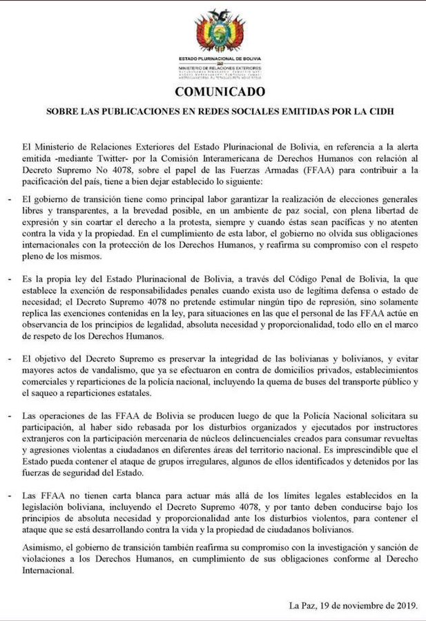 Esto último, en referencia a que el gobierno de facto emitió un decreto que exime de responsabilidad penal a policías y militares cuando actúen en condiciones de necesidad y bajo legítima defensa.