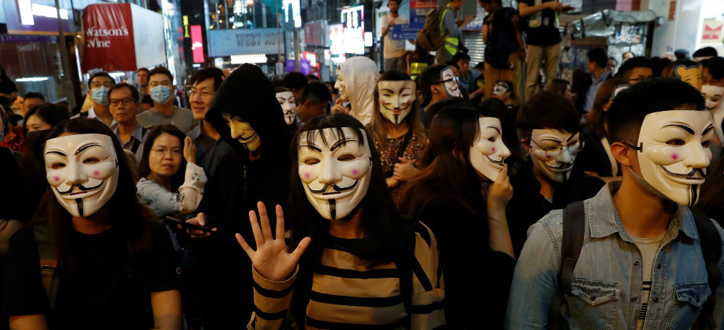 Vestidos en su mayoría de negro y con el rostro cubierto con máscaras o maquillados con los personajes de Guy Fawkes, Joker o Lam, los manifestantes recorrieron calles de Lan Kwai Fong, en un ambiente de fiesta y diversión, hasta que algunos enfrentaron a las fuerzas del orden.
