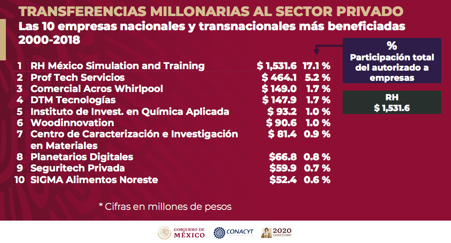 En conferencia matutina, María Elena Álvarez-Buylla Roces, directora general del Conacyt, refirió que entre las empresas beneficiadas se encuentran: Intel, Whirlpool, Volkswagen, Mabe, Honeywell, IBM, Kimberly Clark, Bayer, Monsanto, Femsa Logística y Bimbo. Tan solo estas 11 obtuvieron un total de 891 millones de pesos de recursos públicos.