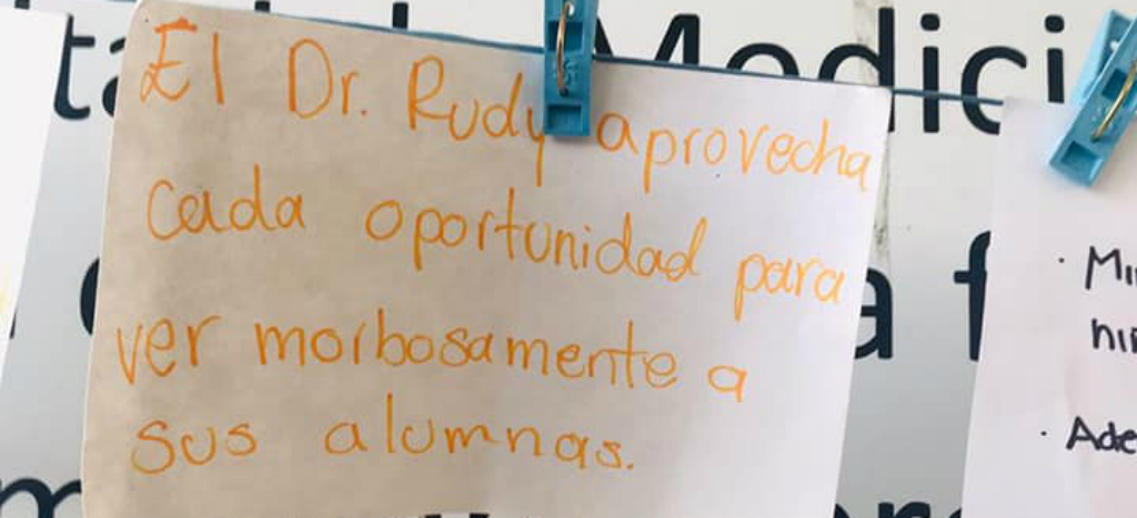 Por los pasillos de la facultad se colocaron mensajes con leyendas como “El Dr. Bernardo Sánchez con tono morboso me dijo que era una de sus fantasías”, “Me puse nerviosa por pasar al frente del grupo y Manzur dijo: y eso que todavía no me has visto desnudo y con mi tanga de elefantito”.