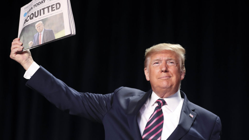“‘Impeachment’, esa es una palabra muy fea para mí. Me llevaron hasta las etapas finales del juicio político, pero nunca pensé que una palabra pudiera sonar tan bien: absolución total”, clamó Trump.