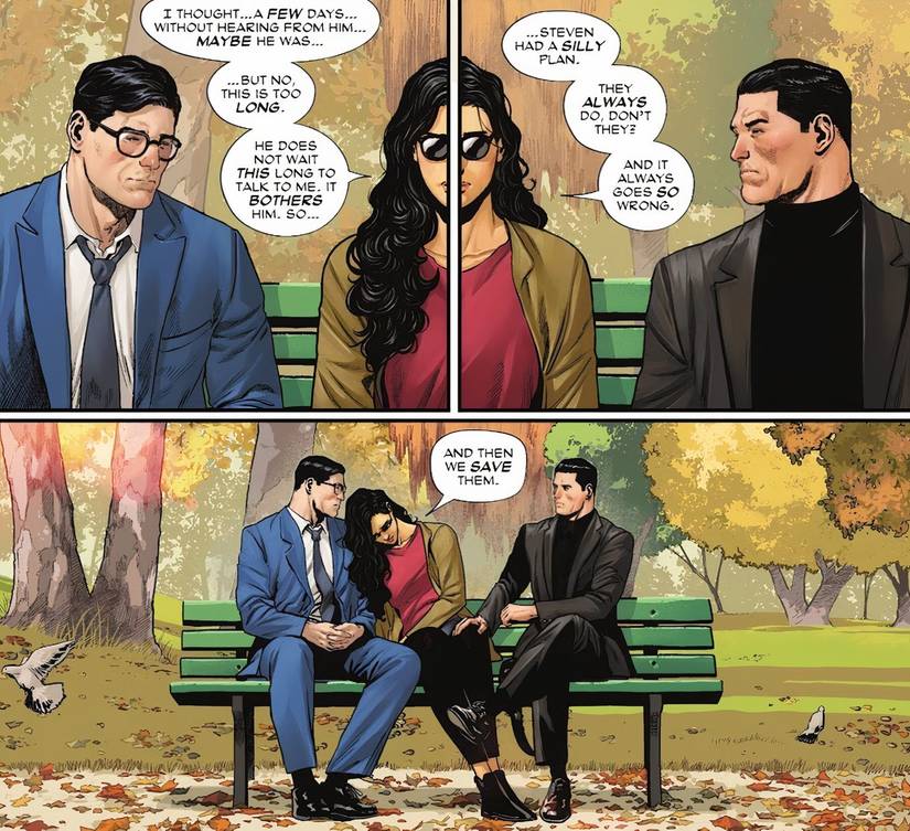 Este momento entre la Trinidad comienza con la narración y el arte de Martian Manhunter en la nueva Watchtower, donde monitorea los canales de comunicación de la Tierra. A través de conversaciones policiales y militares, descubre que Steve Trevor está muerto. Esta revelación pasa directamente a Diana, sentada sola en un banco en Washington, DC, vestida de civil. Sin embargo, siente que no está sola; reconociendo la presencia, dice, “No tienes que ponerte de puntillas. Sé que estás aquí. ¿Y por qué? Bruce y Clark se unen a ella en el banco. Aunque ninguno de los dos habla, está claro que han venido a dar la noticia sobre Steve..