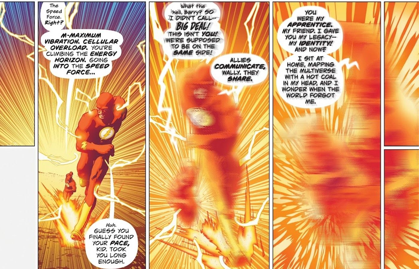 Al detenerse en las inseguridades y las dudas de Wally, este cómic se siente como un reconocimiento consciente del debate sobre el legado del héroe. Wally siente que constantemente debe elevar el listón y así elevarse al nivel del héroe original. Muchos lectores siempre preferirán al portador del manto original, mientras que quienquiera que asuma ese manto a continuación siempre tendrá dificultades para estar a la altura de las expectativas. En el universo, Wally lucha por ser el flash en un mundo que no le permitirá vivir por debajo o más allá del original, y las expectativas poco realistas continúan devorándolo.