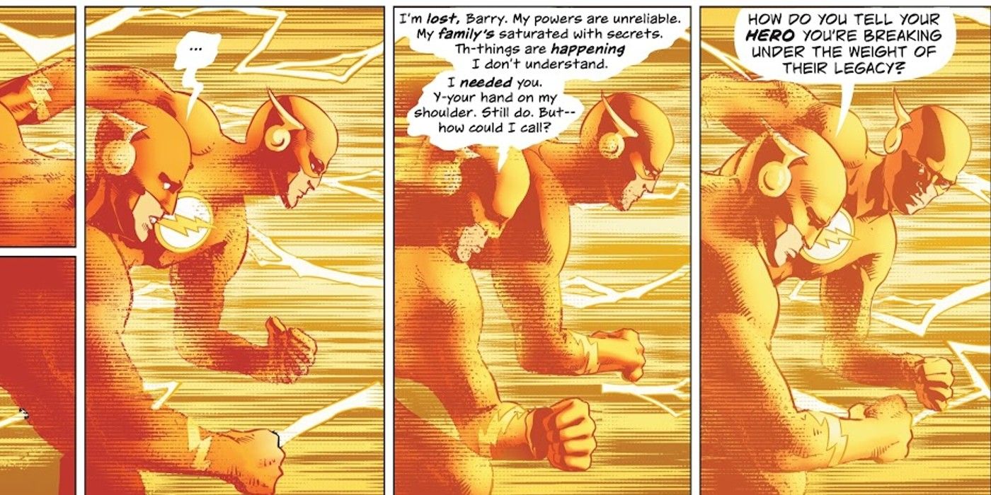 Wally West admite que el peso del legado de Barry Allen lo está desgastando El flash #6 de Simon Spurrier y Mike Deodato Jr. Los dos héroes se toman un momento para discutir sus quejas entre sí, donde Wally admite que incluso si Barry pudiera ser su luz guía en una época oscura, no se atrevía a llamar a su tío. Como Wally comparte con su antiguo mentor: “¿Cómo le dices a tu héroe que te estás derrumbando bajo el peso de su legado?”