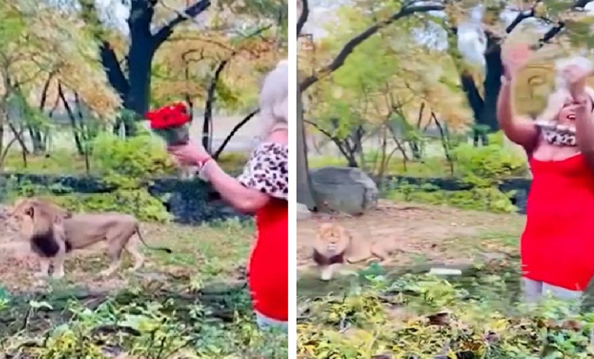 Con una peluca: mujer invade la jaula de leones y les baila con flores