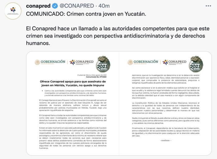 El Consejo Nacional para Prevenir la Discriminación (Conapred) se sumó al reclamo de justicia por el asesinato de José Eduardo Ravelo, quien luego de ser detenido de manera arbitraria, sufrió tortura y abuso sexual probablemente por policías municipales en Mérida, Yucatán.