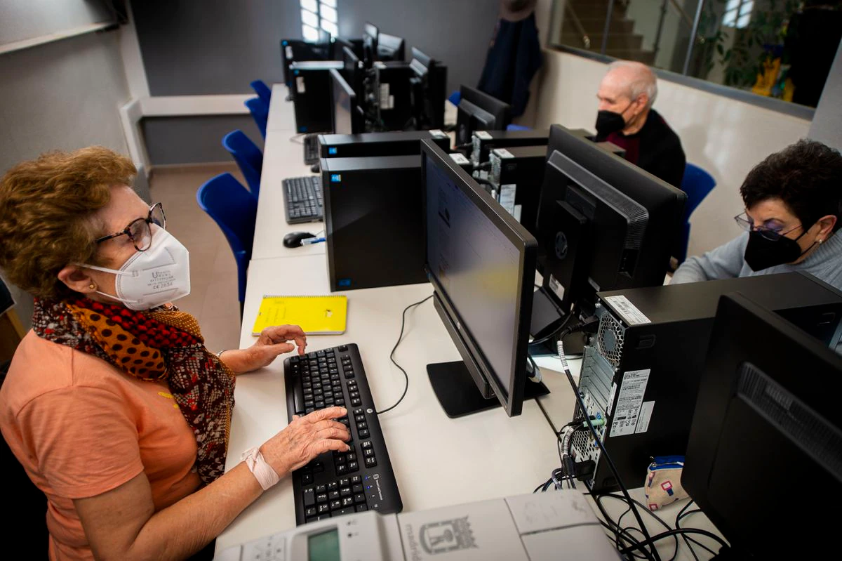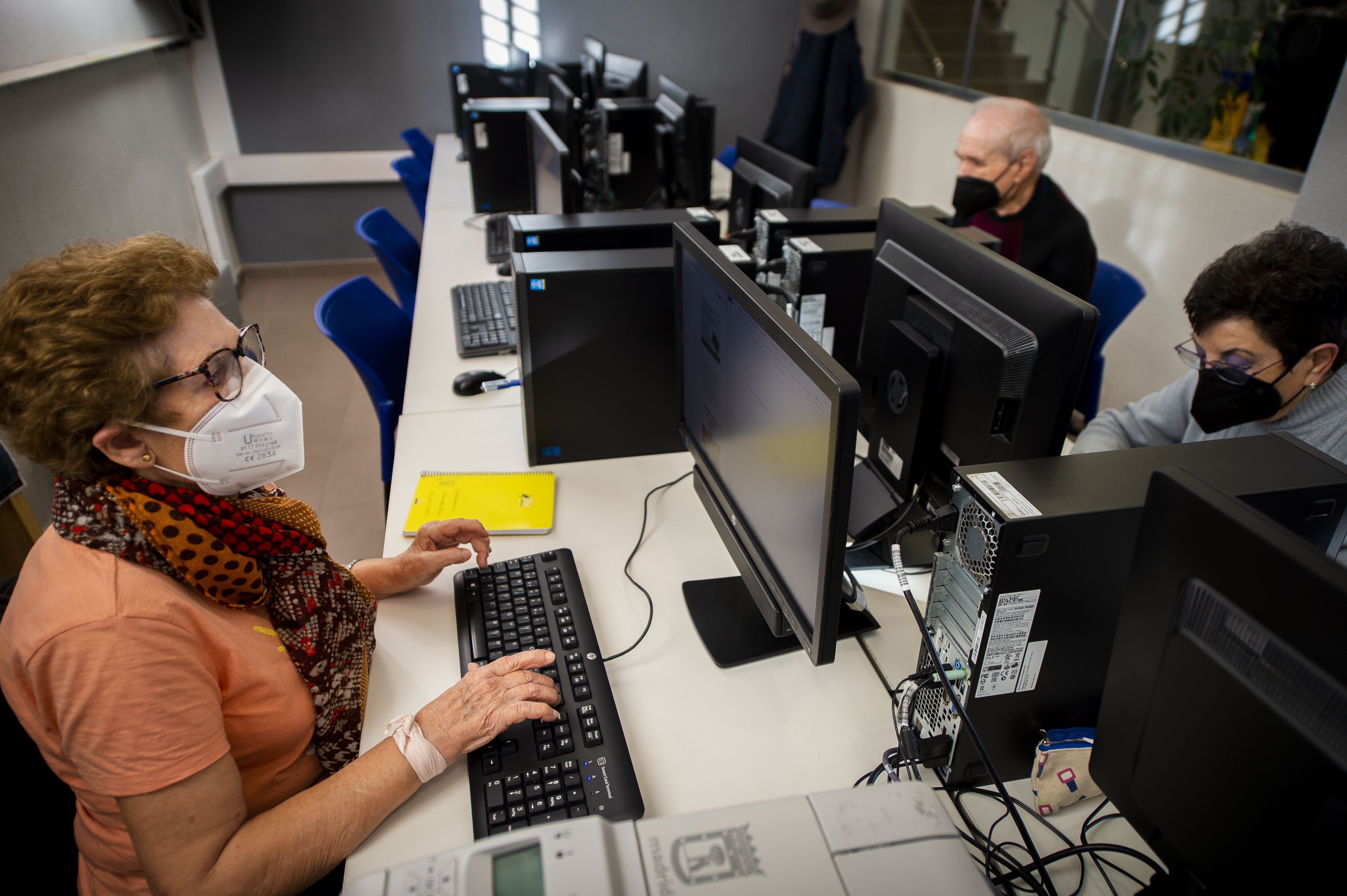 Sabina Sanz mira la pantalla del ordenador. Un poema de Gustavo Adolfo Bécquer, Amor eterno, ocupa el documento. El ejercicio consiste en buscarlo en la Red, copiar el texto y llevarlo a Word. Una vez allí, se cambian la letra, el tamaño, el color, se inserta una imagen. Esta es una clase de informática e internet para mayores. Ella tiene 72. Se frustra porque no le sale. “Vengo porque lo necesito, y me siento como una inútil si no me sé manejar”, dice moviendo mucho las manos. Le encantaría conseguir las citas con el médico por internet, pero no sabe hacerlo, o no haber tenido que pedir ayuda a su hijo para tramitar una transferencia y pagar la lotería de Navidad que compró en el pueblo. Así que aquí está, cerca ya del mediodía de un miércoles, en un aula cuya misión es aportar algo de luz en mitad de un gran apagón digital.
