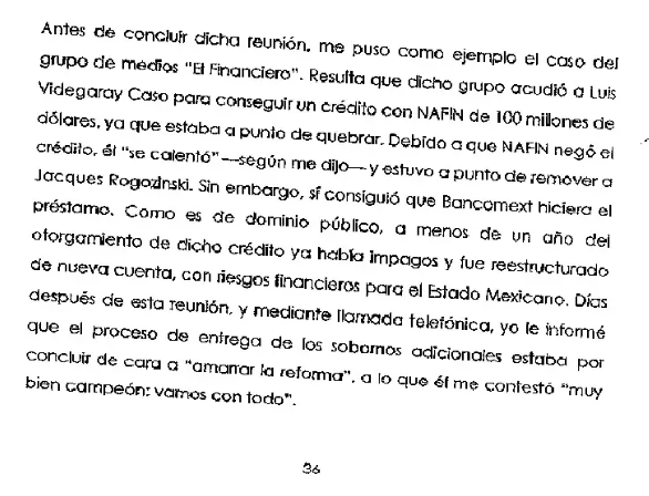 “Antes de concluir dicha reunión me puso como ejemplo el caso del grupo de medios El Financiero. Resulta que dicho grupo acudió a Luis Videgaray Caso para conseguir un crédito con Nafin de 100 millones de dólares, ya que estaba a punto de quebrar”, asegura Lozoya.