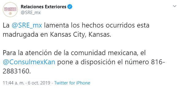 Por su parte, la SRE lamentó los hechos ocurridos y reiteró que el apoyo del Consulado de México en Kansas está listo para brindar todo la ayuda necesaria a la comunidad mexicana en aquella región.