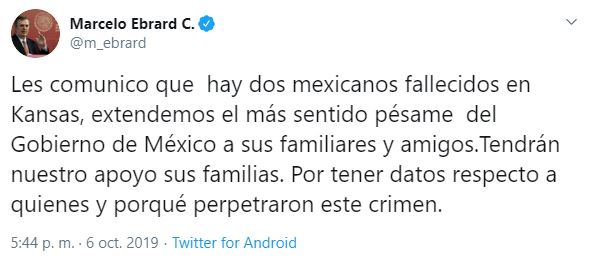 “Les comunico que hay dos mexicanos fallecidos en Kansas, extendemos el más sentido pésame del Gobierno de México a sus familiares y amigos. Tendrán nuestro apoyo sus familias. Por tener datos respecto a quiénes y porqué perpetraron este crimen”, tuiteó.
