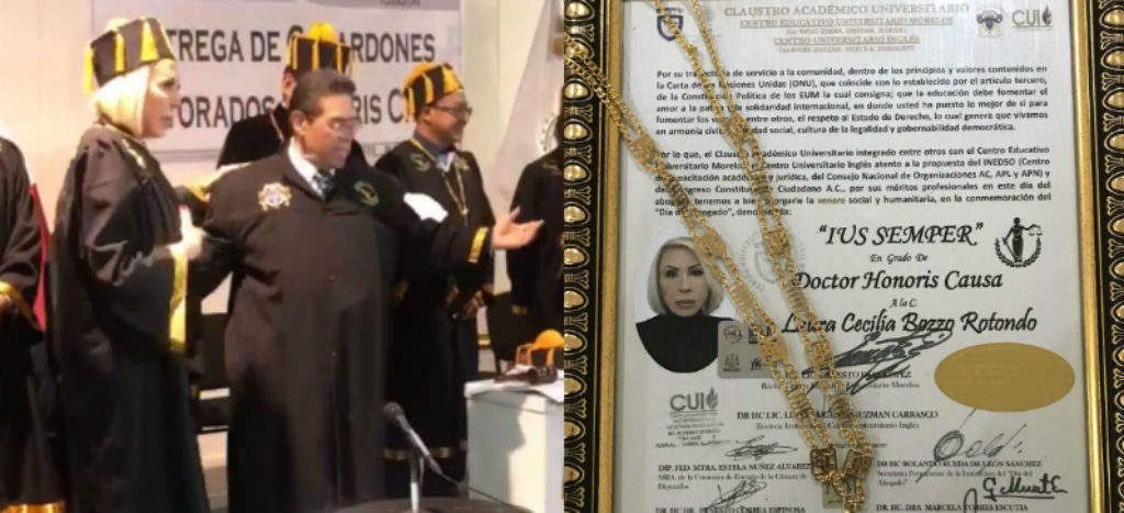 La conductora de televisión Laura Bozzo recibió el martes un doctorado Honoris Causa del Claustro Académico Universitario y una medalla por su “lucha en defensa de la mujer y contra la trata”, en un auditorio del Congreso de la Ciudad de México.
