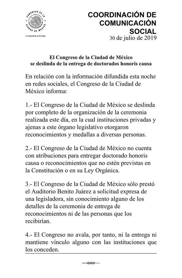 En un comunicado, el Congreso de la Ciudad de México se deslindó por completo de la organización de la ceremonia, argumentando que el Claustro Académico Universitario es ajeno al órgano legislativo, así como los reconocimientos y medallas que éste entregó.