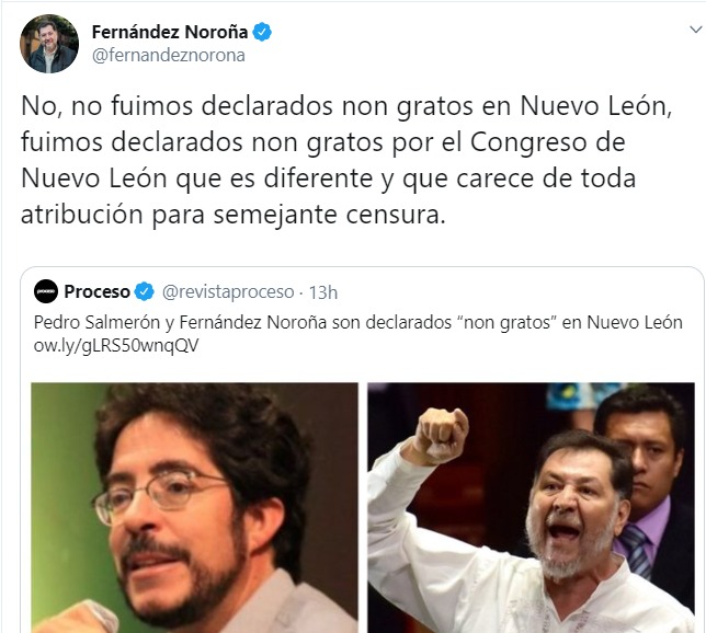 Fernández Noroña respondió en un artículo publicado en Facebook: “Que la derecha me considere y me señale como “persona non grata”, es para mí un timbre de orgullo. Pero que se enmascaren queriendo hacerlo a nombre del pueblo de Nuevo León, simplemente no se los tolero”.