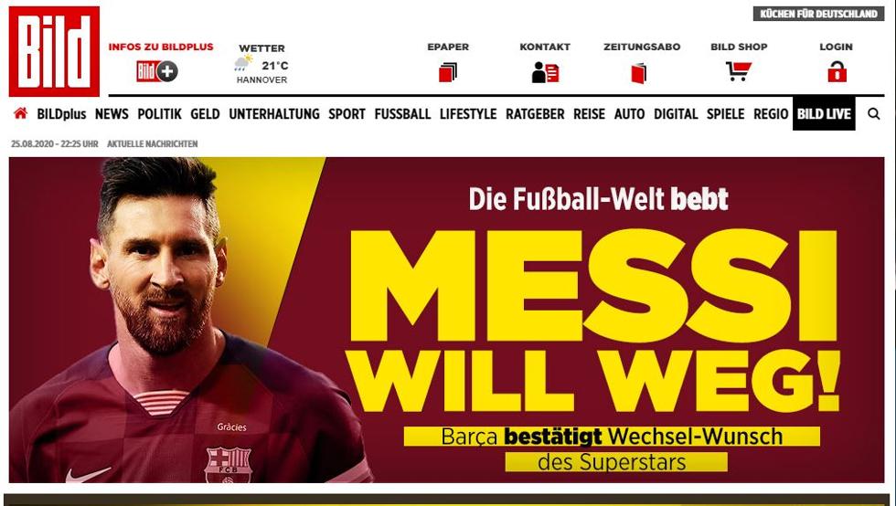 En Alemania el Bild abre su web con el titular: “¡Messi quiere irse!”. “El Barça confirma el deseo de cambio de la superestrella”, continúa. “¡Agárrate fuerte! Con esta noticia tiembla el Barcelona y el mundo del fútbol”, empieza el texto del diario germano.