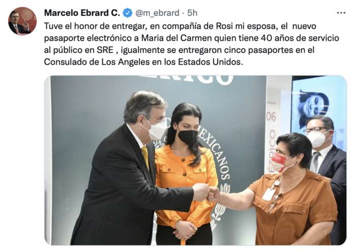 Durante la presentación, Ebrard Casaubon entregó el primer pasaporte electrónico a María del Carmen, “quien tiene 40 años de servicio al público en SRE , igualmente se entregaron cinco pasaportes en el Consulado de Los Angeles en los Estados Unidos”, informó a través de Twitter.