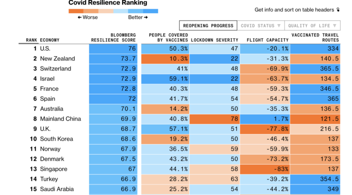 Bloomberg dio a conocer “los mejores y peores lugares para estar mientras el mundo finalmente reabre” por la pandemia.