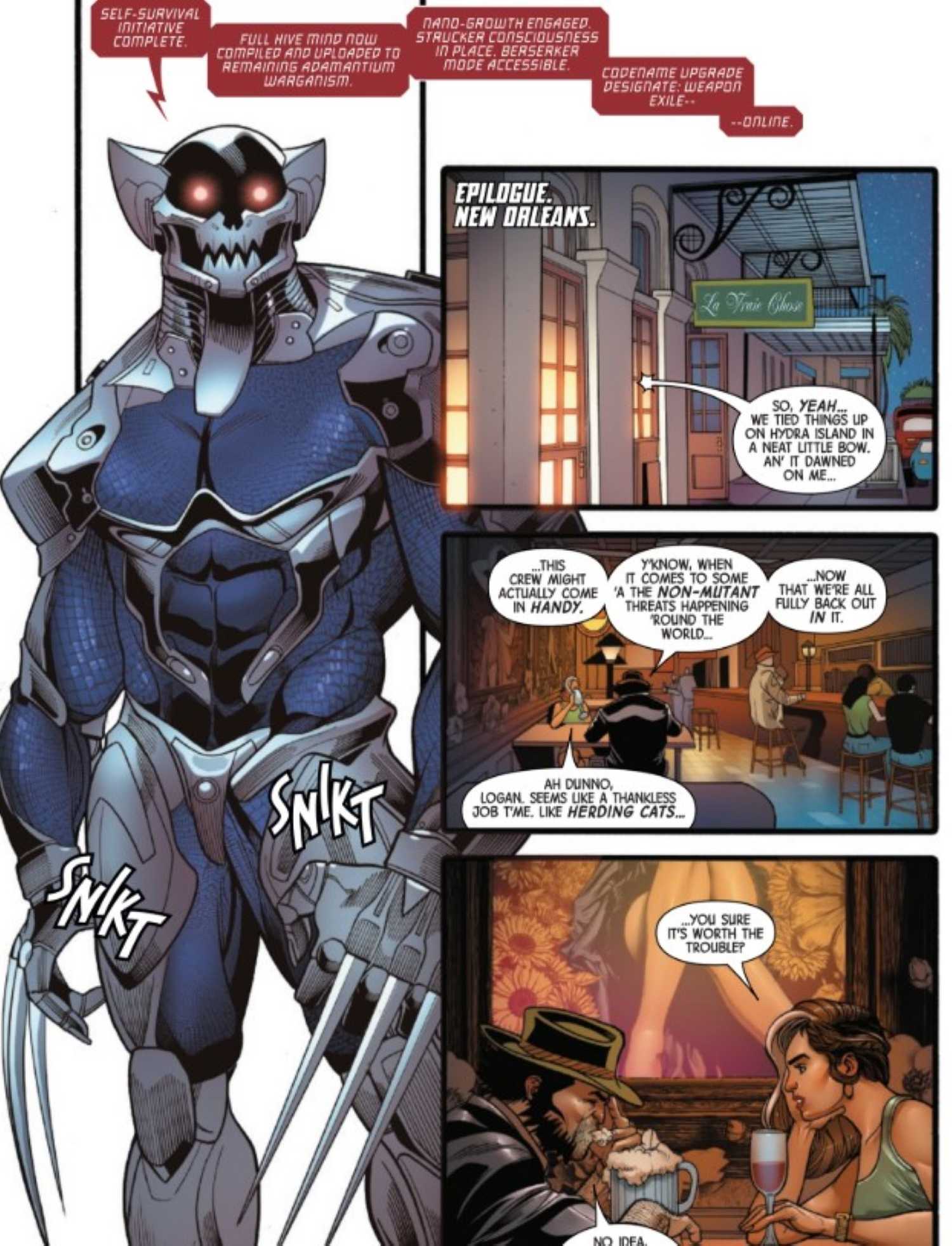Mientras el equipo deja la batalla creyendo que han destruido todas las TMD y evitó que Strucker suba su conciencia, el epílogo revela lo contrario. Una copia digital de la mente de Strucker se ha transferido con éxito a una unidad sobreviviente: el exilio de armas. Después de su exitosa inicialización, el robótico Wolverine informa, “Iniciativa de auto-supervivencia completa. Mente de colmena completa ahora compilada y cargada para restante Warganismo de Adamantium. Nano-crecimiento comprometido. Conciencia de Structer en su lugar. Modo Berserker Accesible. Designe la actualización del nombre de código: Exilio de armas, en línea”. Con eso, El malvado Wolverine de Marvel está oficialmente operativo al final del temaalgo que seguramente volverá para perseguir el equipo X.