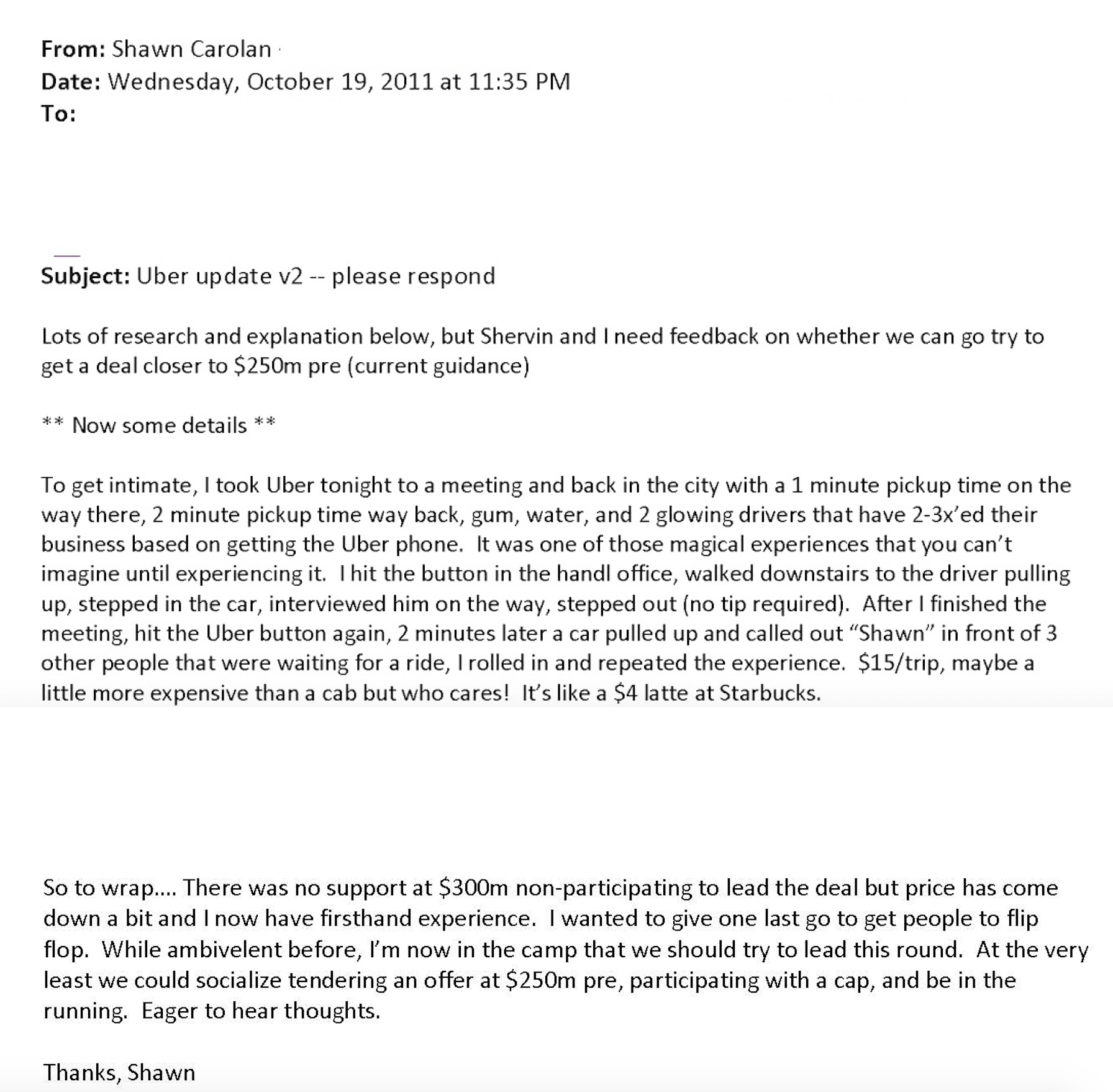 El último esfuerzo del socio de Menlo Ventures, Shawn Carolan, para convencer a su empresa de invertir en Uber a fines de 2011.