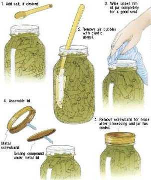 Los frascos vacíos que se utilizan para verduras, carnes y frutas que se procesan en una envasadora a presión no necesitan esterilizarse previamente. Tampoco es necesario esterilizar previamente los frascos para frutas, tomates y alimentos en escabeche o fermentados que se procesarán durante 10 minutos o más en una envasadora de agua hirviendo.