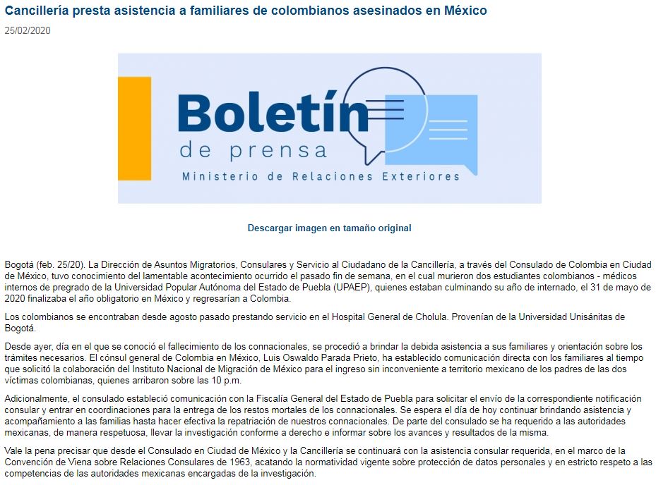 “Los colombianos se encontraban desde agosto pasado prestando servicio en el Hospital General de Cholula. Provenían de la Universidad Unisánitas de Bogotá”, detalló el Ministerio de Relaciones Exteriores.