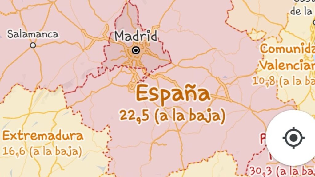 Una vez en ella, pulsamos en el icono de capas, situado en la esquina superior derecha y, a continuación, en «Datos de Covid-19». Aceptamos, y podemos ver el mapa con diferentes tonos, que varían del color amarillo al rojo, en función de la tasa de incidencia del coronavirus (la media de nuevos casos por cada 100.000 habitantes en la última semanas). Además, muestra si la tendencia es ascendente o descendente.