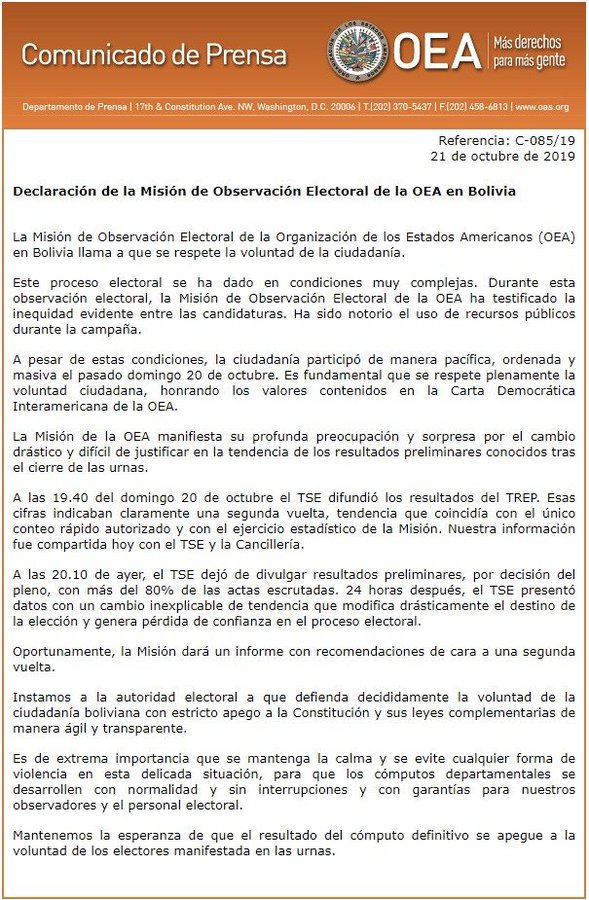 El Jefe de la Misión, el excanciller de Costa Rica, Manuel González, destacó que el proceso electoral en Bolivia se había dado en condiciones muy complejas. “Durante esta observación electoral hemos testificado la inequidad evidente de las candidaturas, ha sido notorio el uso de recursos públicos durante la campaña. A pesar de estas condiciones, la ciudadanía participó de manera pacífica, ordenada y masiva el pasado domingo 20 de octubre”, dijo.