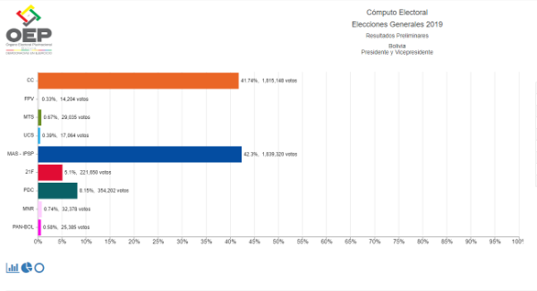 No obstante, hasta las 8:04 (hora local) de este 22 de octubre, el cómputo definitivo oficial, ofrece un resultado más ajustado: 41.74% a favor de Mesa de Comunidad Ciudadana y 42.3% para Morales, candidato del Movimiento al Socialismo-Instrumento Político por la Soberanía de los Pueblos (MAS-IPSP). Pero aún no se supera el 80% de las actas escrutadas.