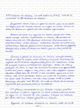 “La PGR reporta que en mi domicilio aseguraron 205.5 millones de dólares. La cifra en dólares era de: 275 millones de dólares, en este rubro la PGR ‘omite’ la cantidad de 70 millones de dólares. Yo guardé tanto dinero en efectivo en mi casa, no es delito en ningún país del mundo cuando su origen es lícito”, manifestó en una carta de puño y letra.
