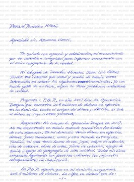 “La PGR reporta que en mi domicilio aseguraron 205.5 millones de dólares. La cifra en dólares era de: 275 millones de dólares, en este rubro la PGR ‘omite’ la cantidad de 70 millones de dólares. Yo guardé tanto dinero en efectivo en mi casa, no es delito en ningún país del mundo cuando su origen es lícito”, manifestó en una carta de puño y letra.