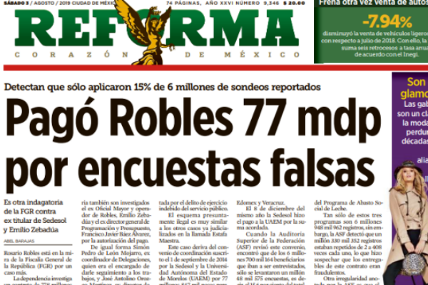 Bajo el título de “Pagó Robles 77 mdp por encuestas falsas” y con la firma de Abel Barajas, el diario Reforma informó este sábado que la Fiscalía está investigando el contrato respectivo cuyo incumplimiento fue detectado por la Auditoría Superior de la Federación.