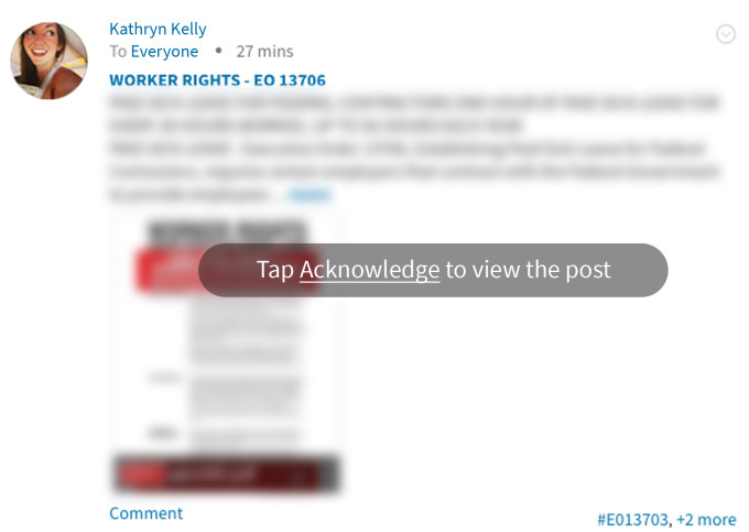 Cuando aparezca en la línea de tiempo de Convo de sus colegas, se verá borroso casi por completo, guárdelo para una línea de asunto y un mensaje pidiéndole que reconozca la publicación. Una vez que lo reconocen deliberadamente, la publicación se desenfoca, el cartel original recibe una alerta que les dice que alguien lo ha leído, y el nombre del lector pasa de la lista "No ha visto" a la lista "Ha visto".