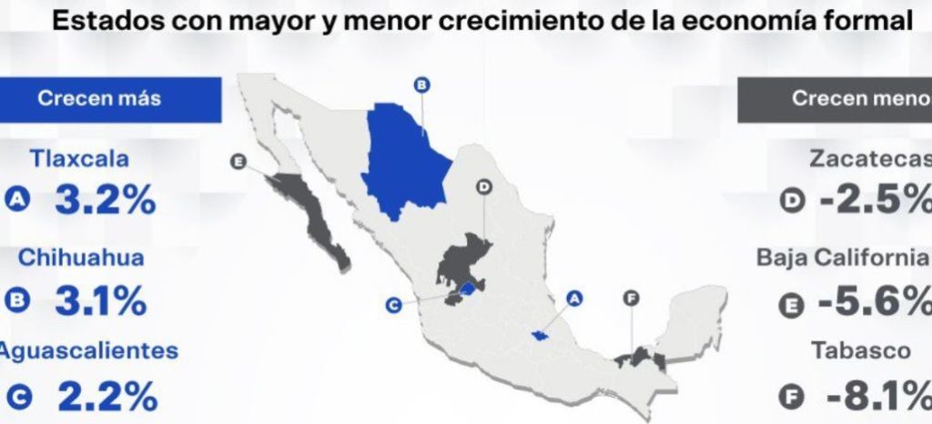Los estados con menor crecimiento en el segundo trimestre del año fueron Zacatecas (-2.5 por ciento), Baja California Sur (-5.6 por ciento) y Tabasco (-8.1 por ciento) con tasas negativas de crecimiento de la economía formal, detalló.