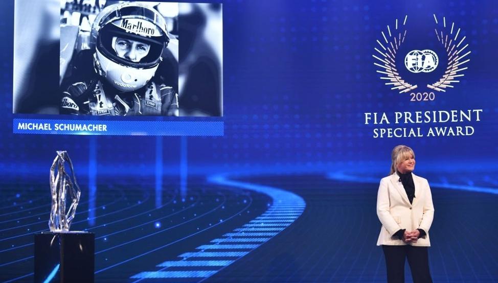 Uno de los momentos más álgidos de la reciente Gala FIA en Ginebra fue el premio conjunto que se llevaron Michael Schumacher y Lewis Hamilton, el FIA President Special Award, por sus siete títulos mundiales de pilotos. Por culpa de la pandemia la mayoría de los premiados e invitados se sumaron telemáticamente a la Gala, fue el caso de Lewis Hamilton desde la sede de Mercedes en Brackley, pero al celebrarse cerca de casa y que Jean Todt, amigo personal de la familia, fuera el anfitrión animó a Corinna Schumacher a subirse al escenario a recibir el premio en nombre de su marido.