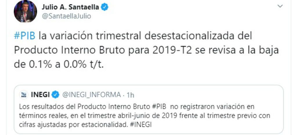 En julio pasado, el instituto informó que la Estimación Oportuna del Producto Interno Bruto (PIB) Trimestral reportó un aumento real de 0.1% en el segundo trimestre de 2019 con relación al trimestre inmediato anterior, lo cual hoy se confirma que no fue así.