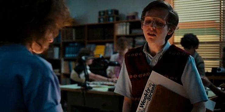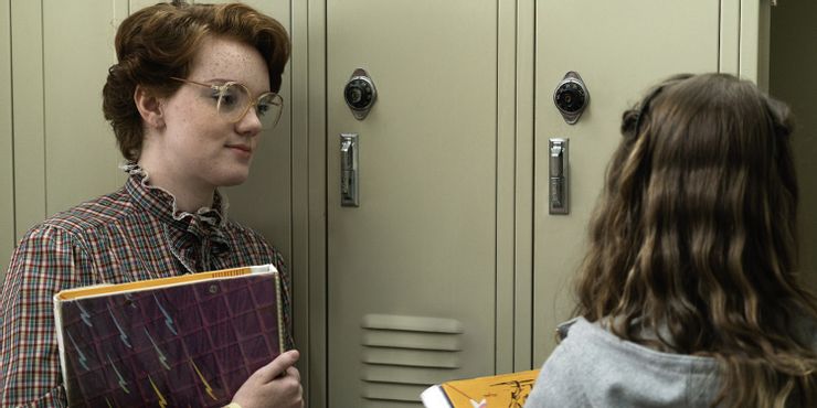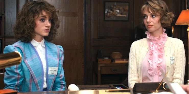 Temporada 4 de Cosas extrañas tiene excelentes atuendos, incluso cuando Nancy se une a Robin Buckley para hacerse pasar por estudiantes que esperan entrevistar a Víctor Creel. Robin se queja de la picazón en la tela y Nancy está muy ocupada y tiene una respuesta sensata para su nueva amiga.